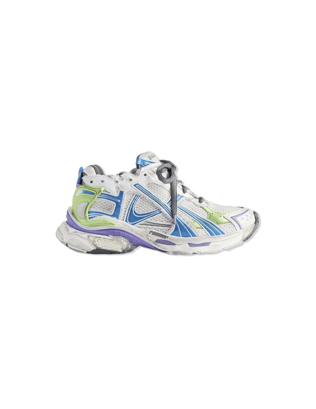 These avant-garde sneakers showcase Balenciaga's iconic Runner design in a dynamic white and blue base with vibrant multicolor accents, blending deconstructed aesthetics with artistic athletic inspiration. The multi-layered silhouette features technical mesh panels and expressive color splashes, creating a perfect fusion of performance functionality and runway-ready creativity.