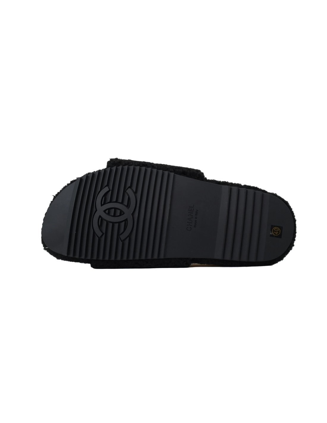 These luxurious slippers showcase Chanel's iconic design in a timeless black wool construction with signature CC logo detailing. The silhouette features premium wool-like materials and elegant quilting patterns, creating a perfect fusion of haute couture craftsmanship and cozy comfort.