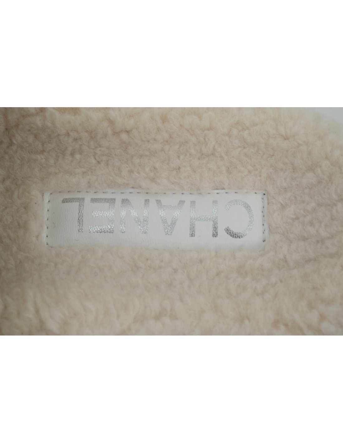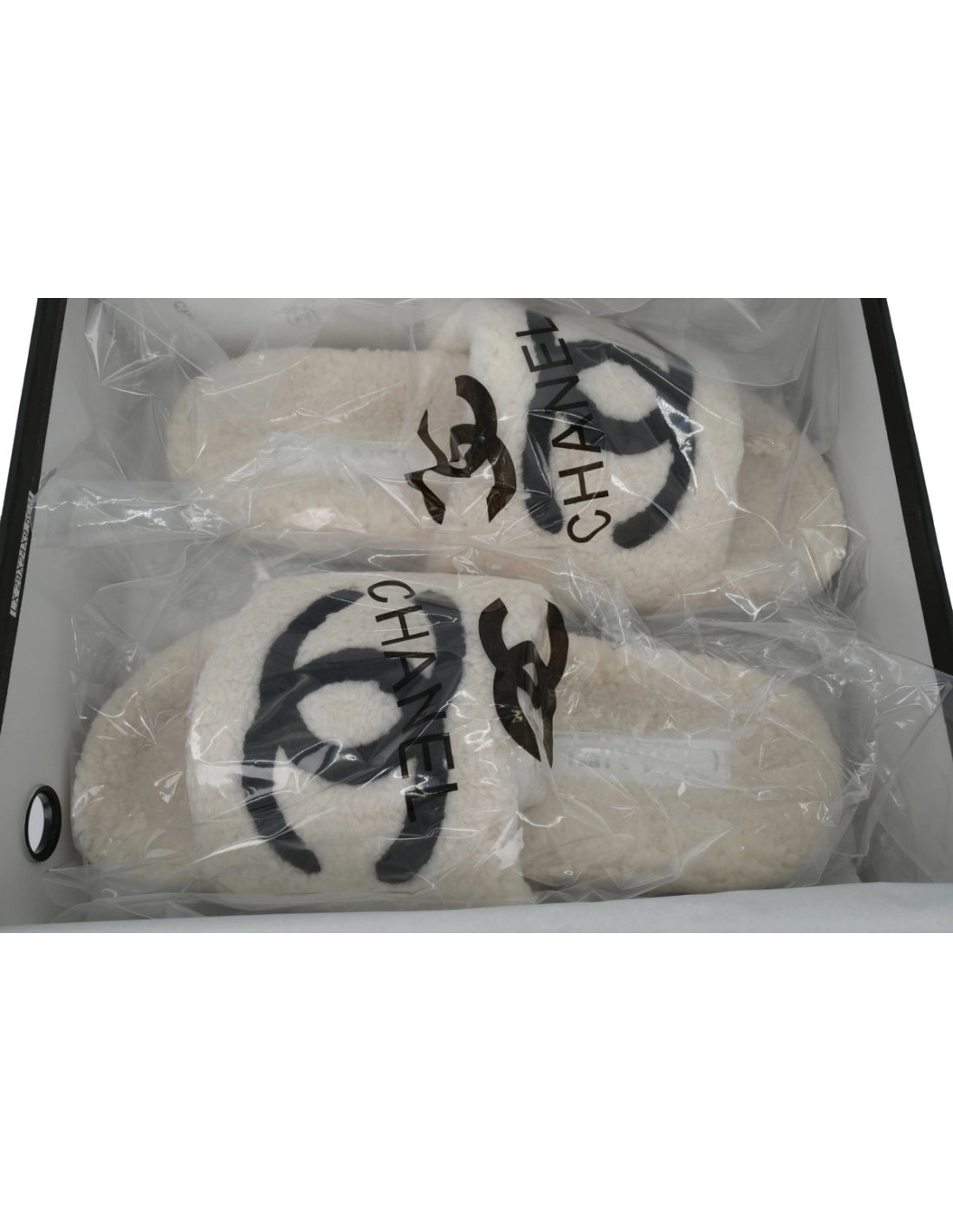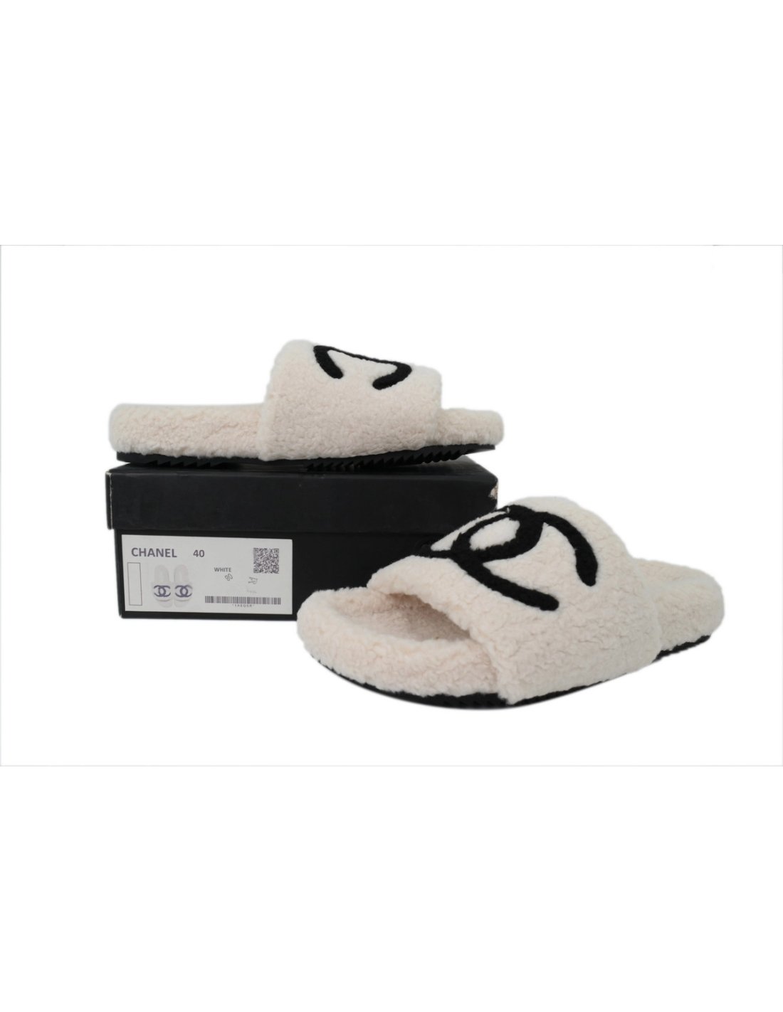 These luxurious slippers showcase Chanel's iconic design in a pristine white wool construction with signature CC logo detailing. The silhouette features premium wool-like materials and elegant quilting patterns, creating a perfect fusion of haute couture craftsmanship and cozy comfort.