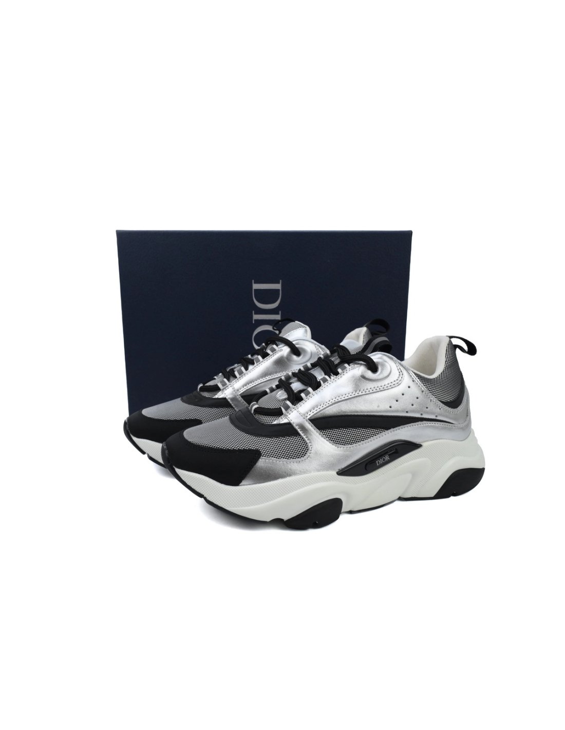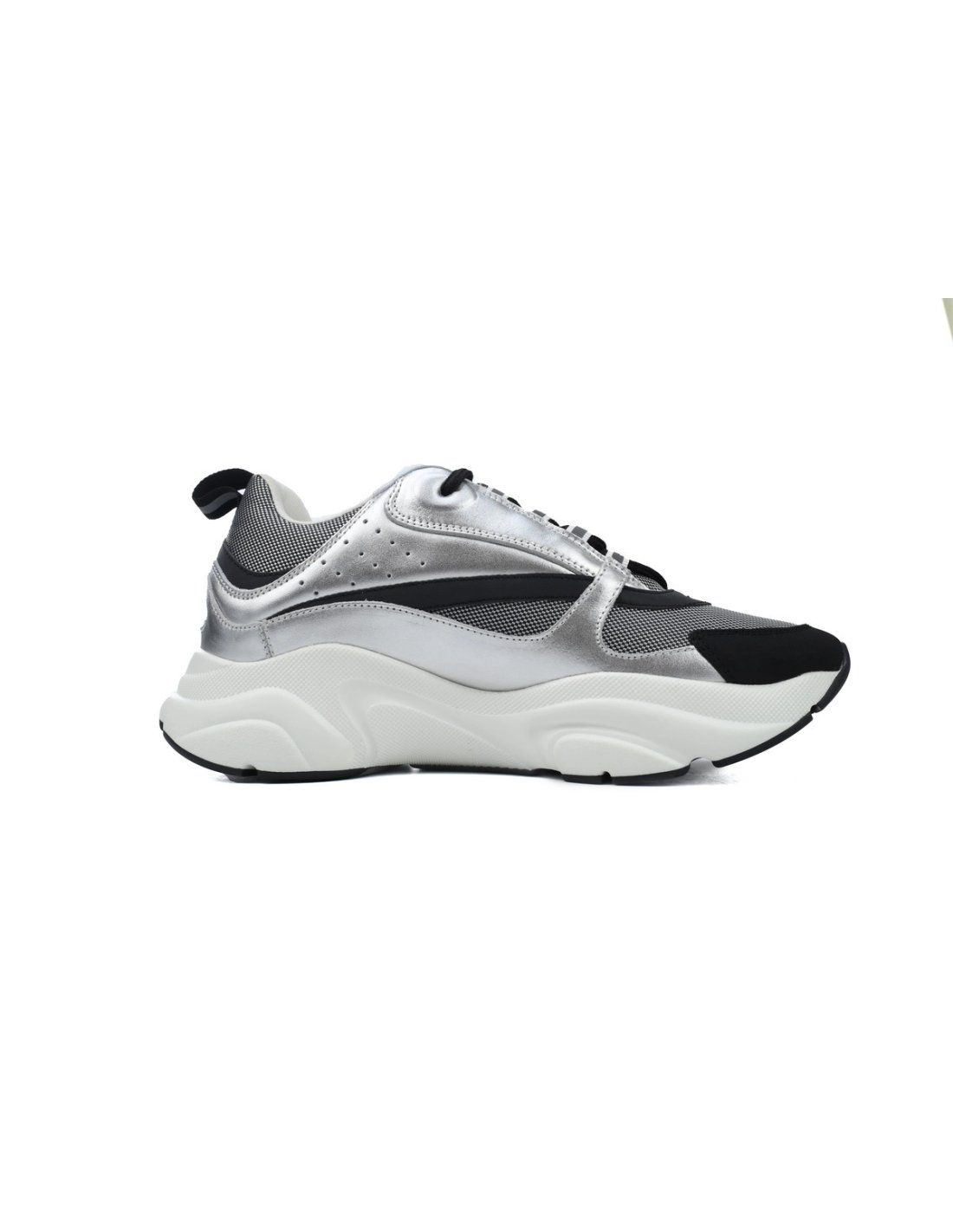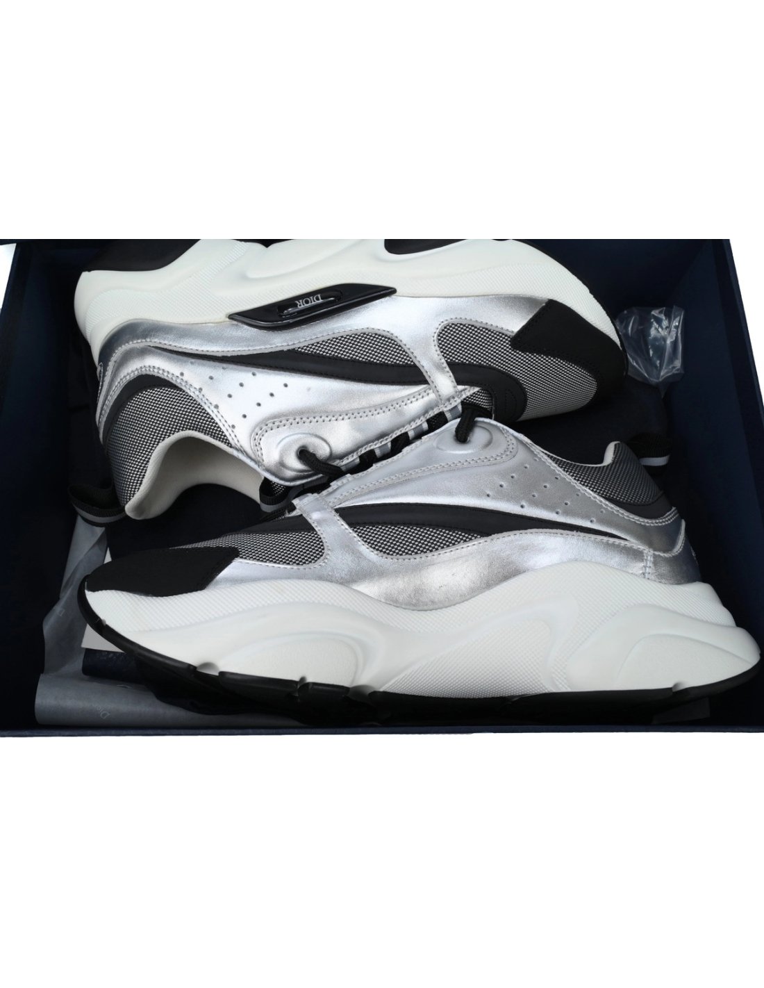 • Style DetailsColor: Silver/BlackMaterial: Calfskin, mesh, and reflective detailsDesign: Multi-layered construction with metallic accentsSole: Thick, sculpted rubber sole for comfort and durabilityBranding: Embroidered "DIOR" logo on the side and tongueSizing: True to size; breathable and supportive