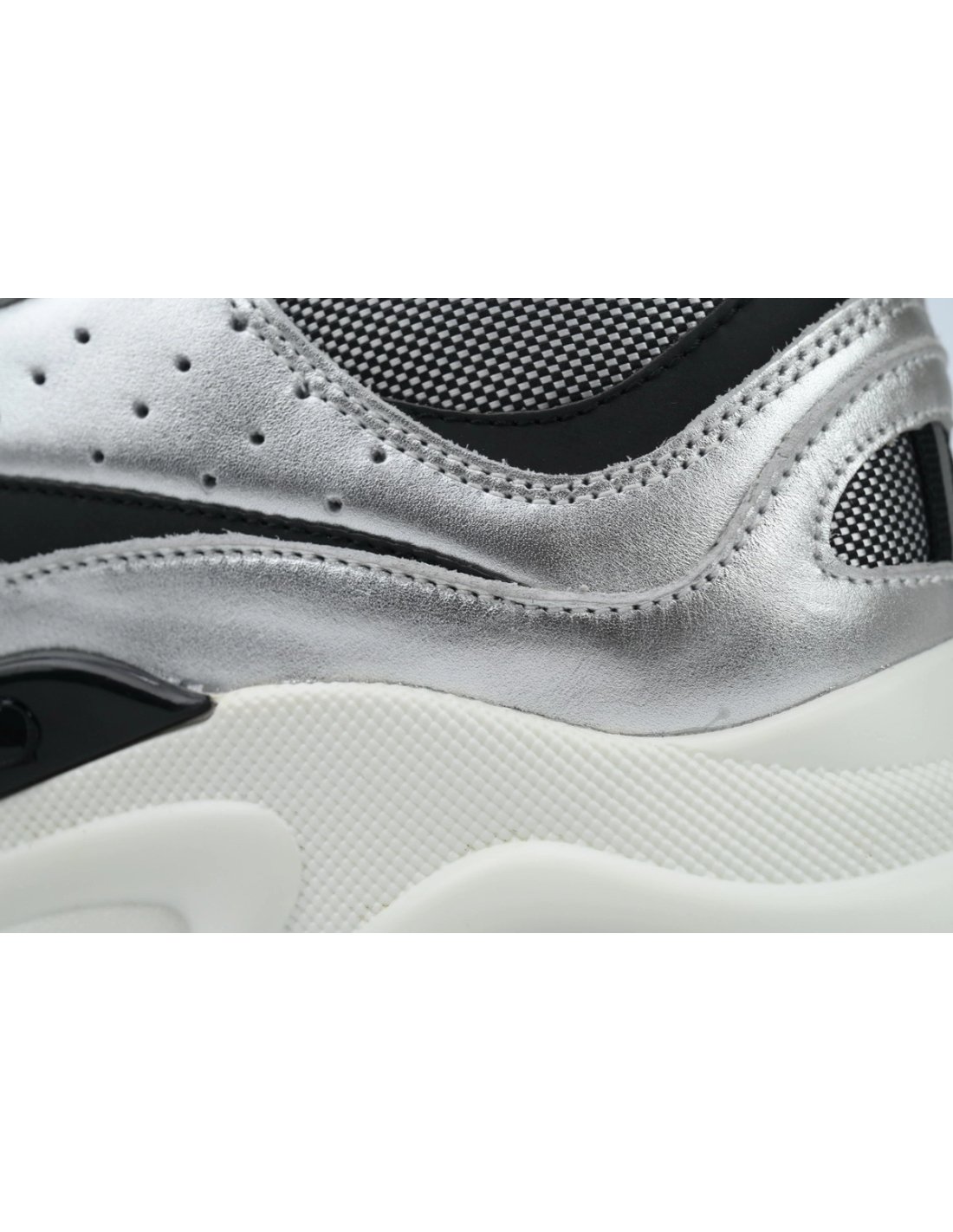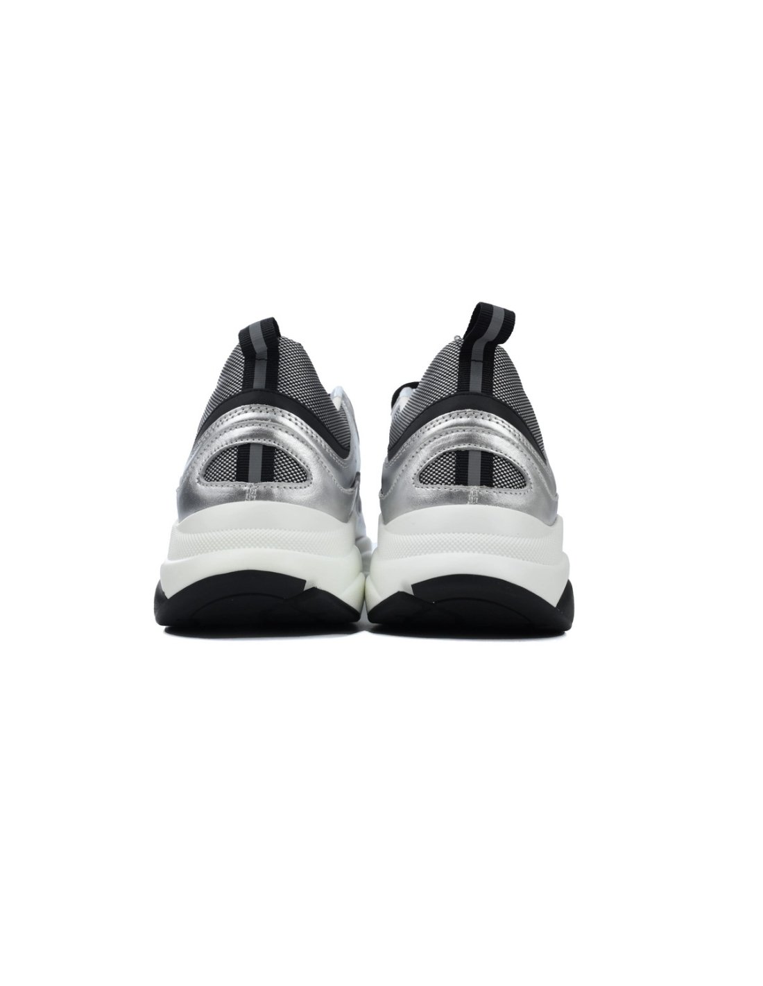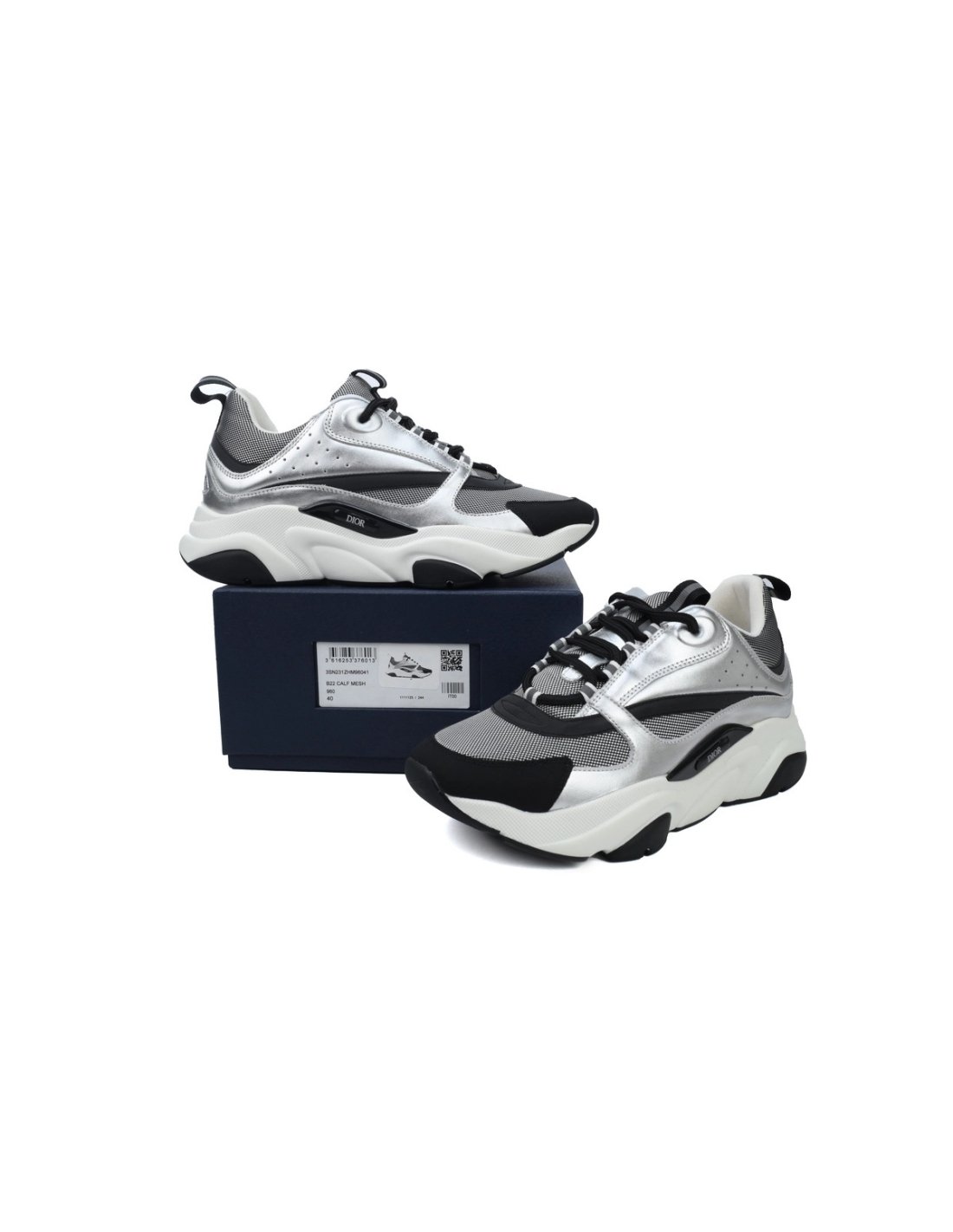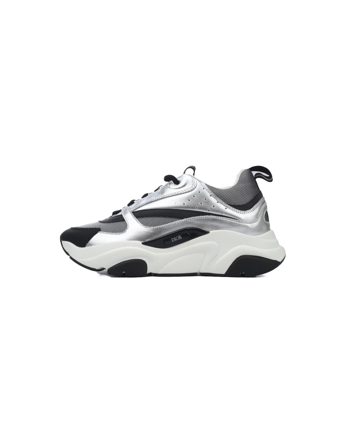 • Style DetailsColor: Silver/BlackMaterial: Calfskin, mesh, and reflective detailsDesign: Multi-layered construction with metallic accentsSole: Thick, sculpted rubber sole for comfort and durabilityBranding: Embroidered "DIOR" logo on the side and tongueSizing: True to size; breathable and supportive