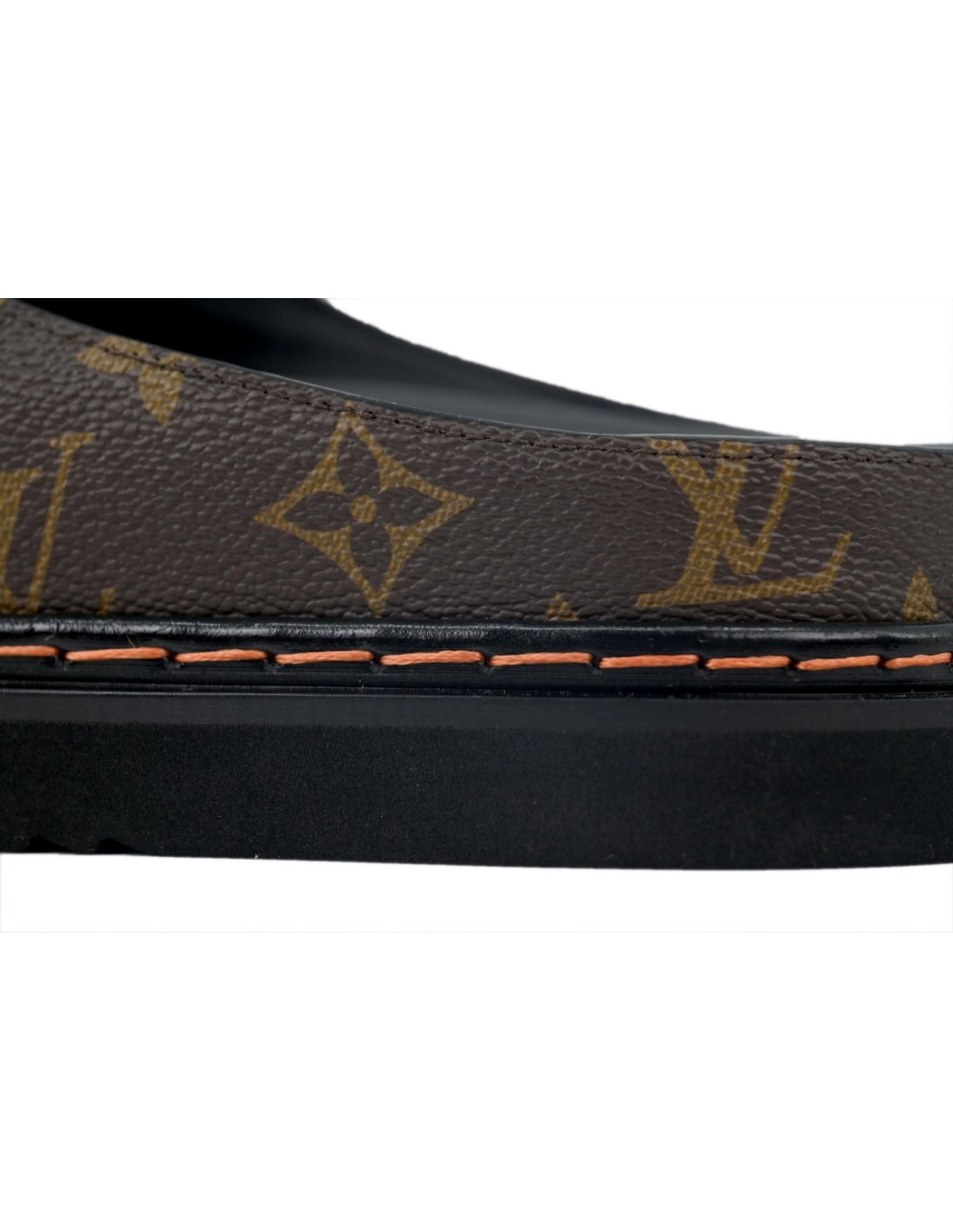 These sophisticated mules showcase Louis Vuitton's iconic LV Easy design in a rich brown colorway, blending effortless elegance with signature luxury. The minimalist silhouette features the distinctive monogram pattern and polished hardware accents, creating a perfect fusion of casual comfort and haute craftsmanship.